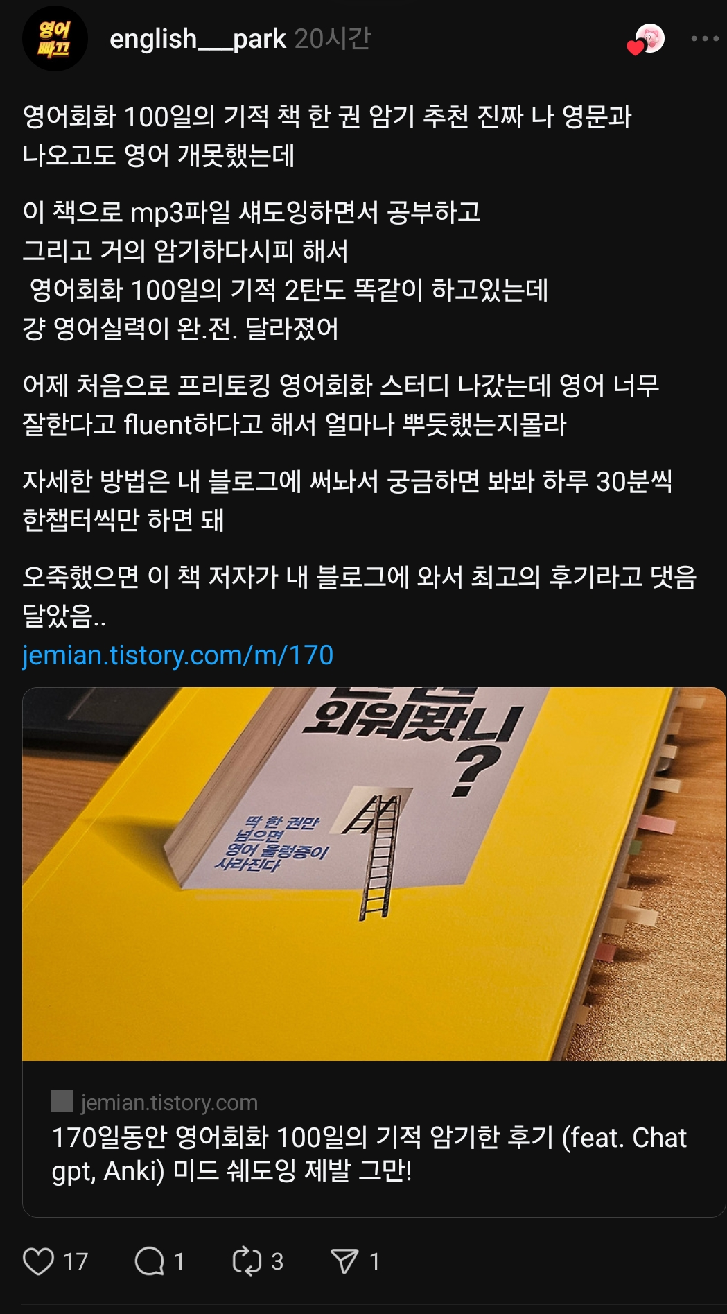 Threads 앱에도 영어공부 방법 알려달라는 분께 댓글로 이렇게 남겼더니 많은 분들이 좋아요를 눌러줬다.