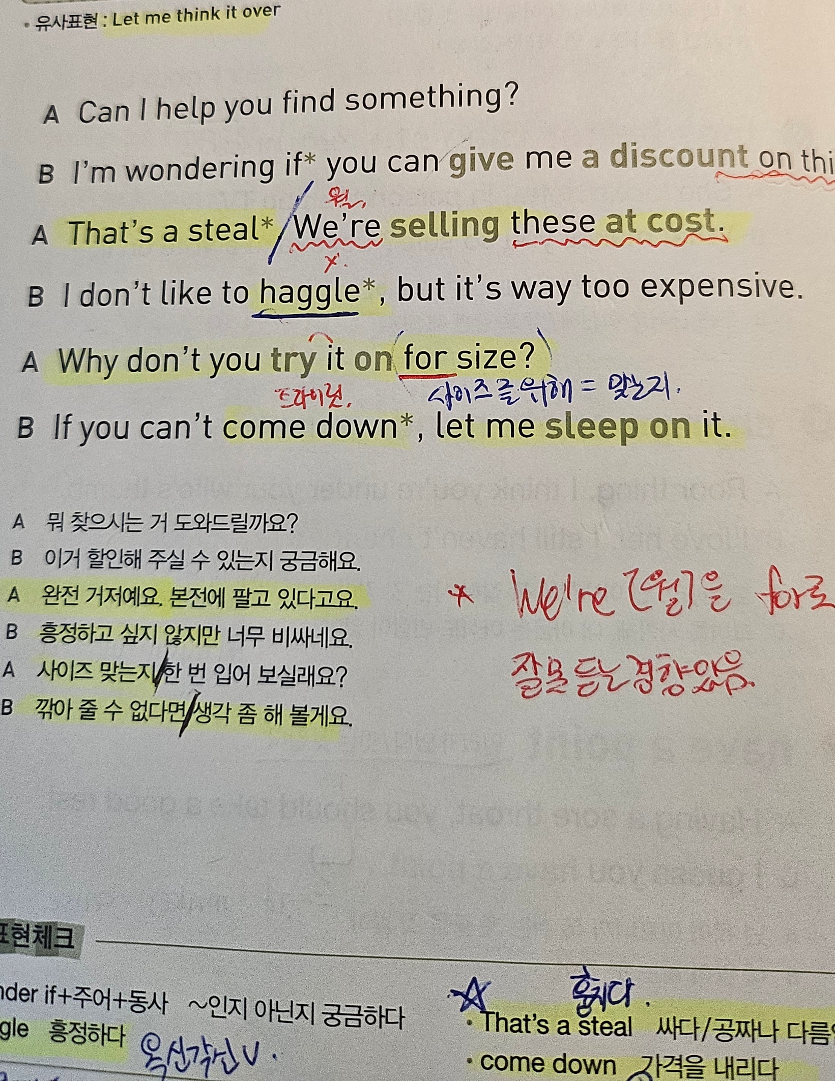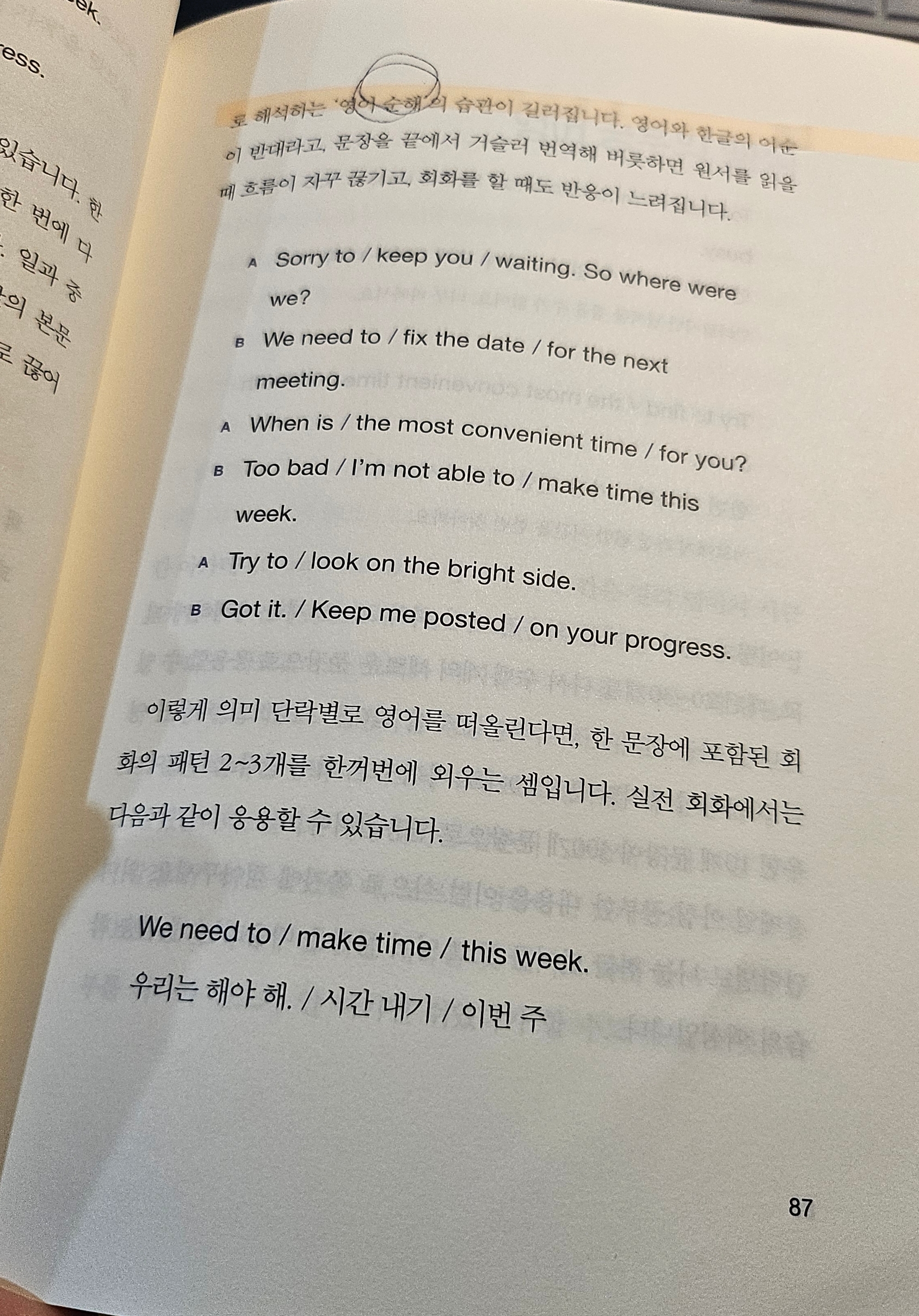 대화문 아래 해석을 보며 /로 표현별로 한국어 어순과 영어 어순이 다른지 체크. 어순대로 끊어서 표현을 외워야 기억하기 쉽고 스피킹할 때도 나온다 예를 들어,