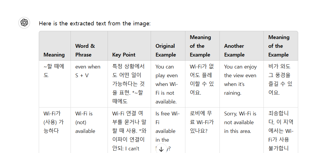 그럼 GPT가 진짜 찰떡같이 표형식으로 정리해줌. 거기에 예시 해석, 추가 원어민 예시, 상황 키포인트까지 정리해달라고 요청한 상태이다. 진심 이제 손으로 정리할 필요가 없다 .. 10초면 gpt가 표로 만들어줌