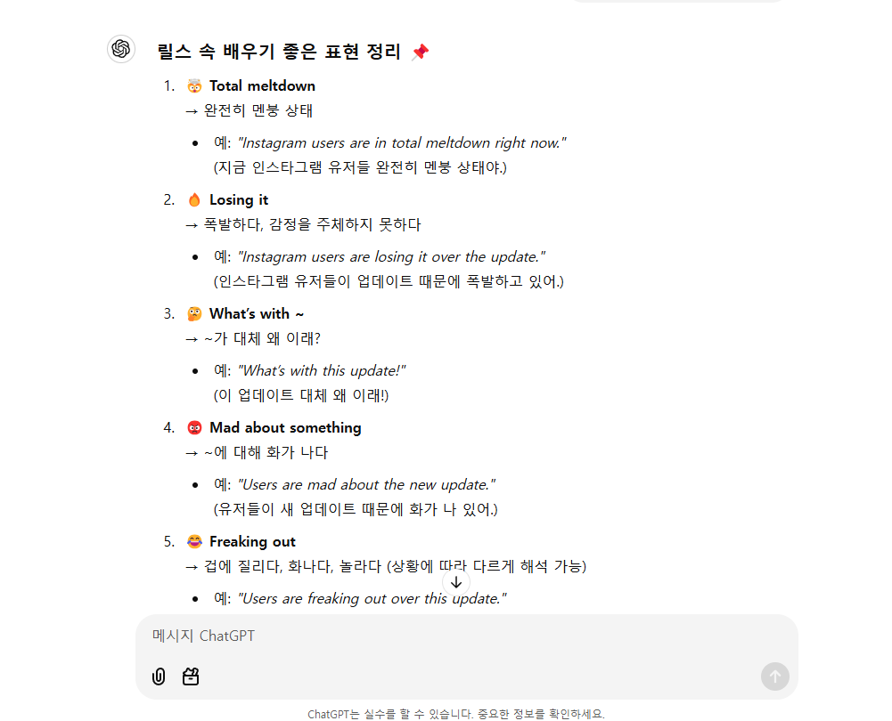 하지만 유튜브 쇼츠랑 다르게 인스타그램은 설명에 자세한 텍스트가 꼭들어가야 한다고 어디선가 또 들었다. 그래서 GPT가 해당 영상의 영어 표현정리 해준 것들을 복붙해서 올린다.