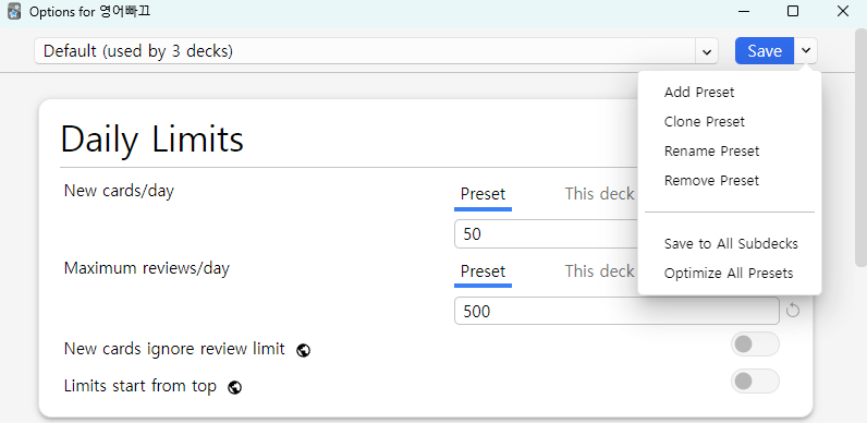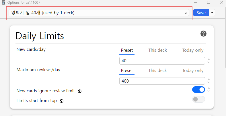 마지막으로 제일 위로 스크롤해서 다시 돌아가보면, Default(기본) 복습 설정을 각 덱별로 바꿀 수 있어요. 지금처럼 기본모드를 바꾸면 제가 설정해놓은 전화영어, 영백기, 오픽, 영어일기 모든 덱의 복습과 학습량이 동일하게 설정돼요. 만약 영백기에 더 집중하고 나머지는 학습량을 줄이고 싶다면, save 옆 화살표 버튼을 누르고 Add preset을 설정해주세요. 새로운 복습주기 설정의 이름을 입력하고 OK를 눌러줍니다. 저는 영백기 일 40개라는 이름으로 저장할게요. 그리고 아까 했던 것처럼 복습주기 설정하듯, 일일학습량, 총 복습량 바꾸고 싶은 부분을 클릭하고 저장합니다.