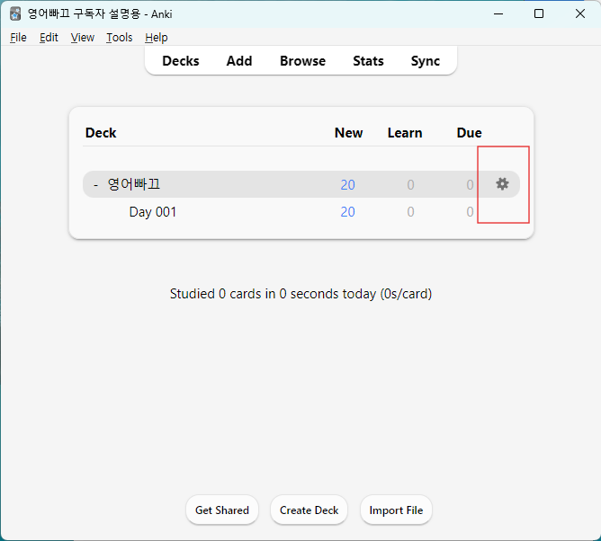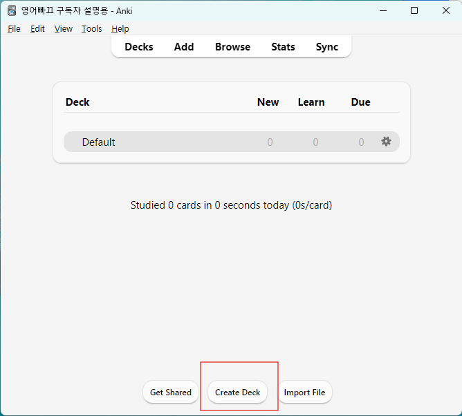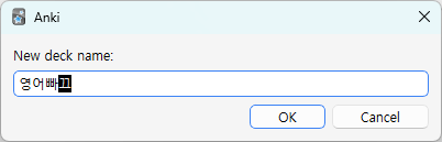 이제는 안키에서 단어 폴더라고 부를 수 있는 덱을 만들어볼게요. 안키 홈으로 돌아와서, 아래에 Create Deck 을 클릭합니다. 덱 이름을 설정하고 OK를 누르면 됩니다. 덱 이름에 이모티콘 삽입은 모바일에서 덱 우측 톱니바퀴 누르고 이모티콘 삽입하여 이름 변경하면 됩니다. 이렇게하면 덱이 만들어졌죠?