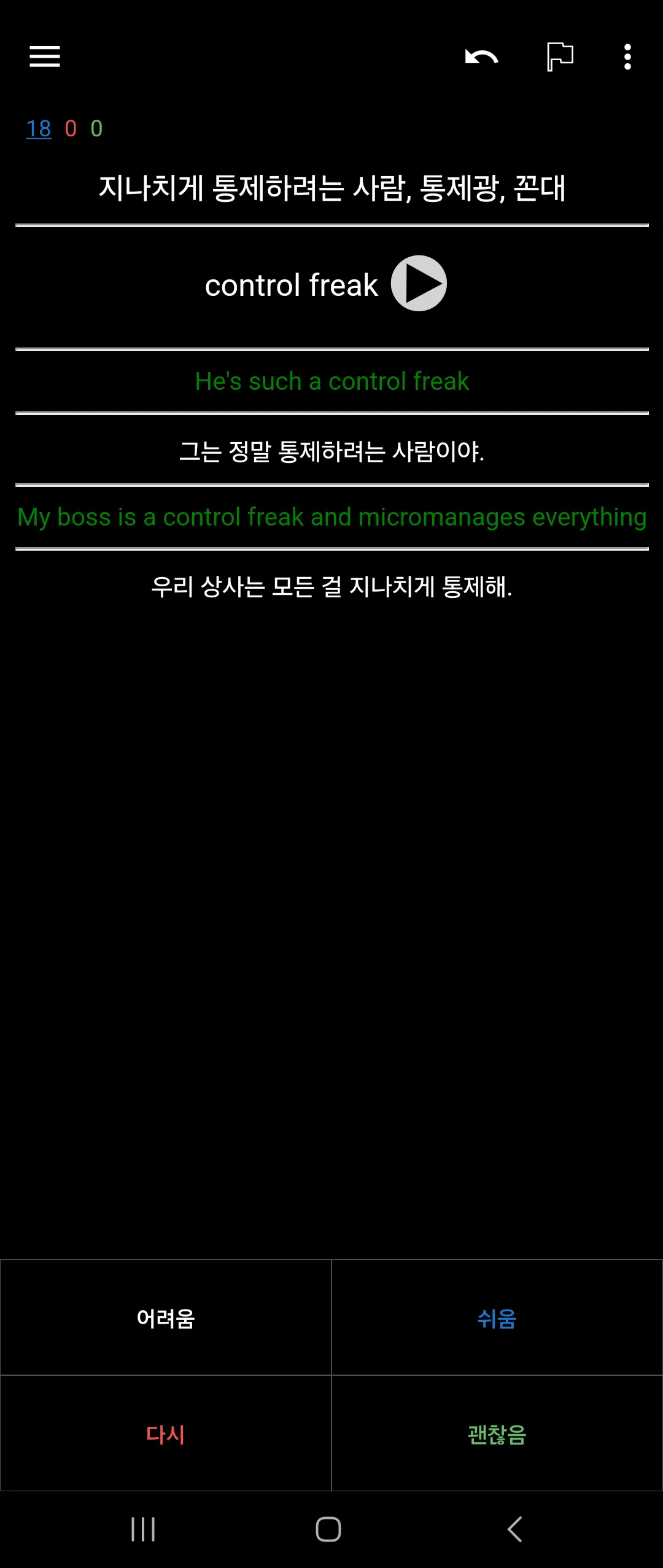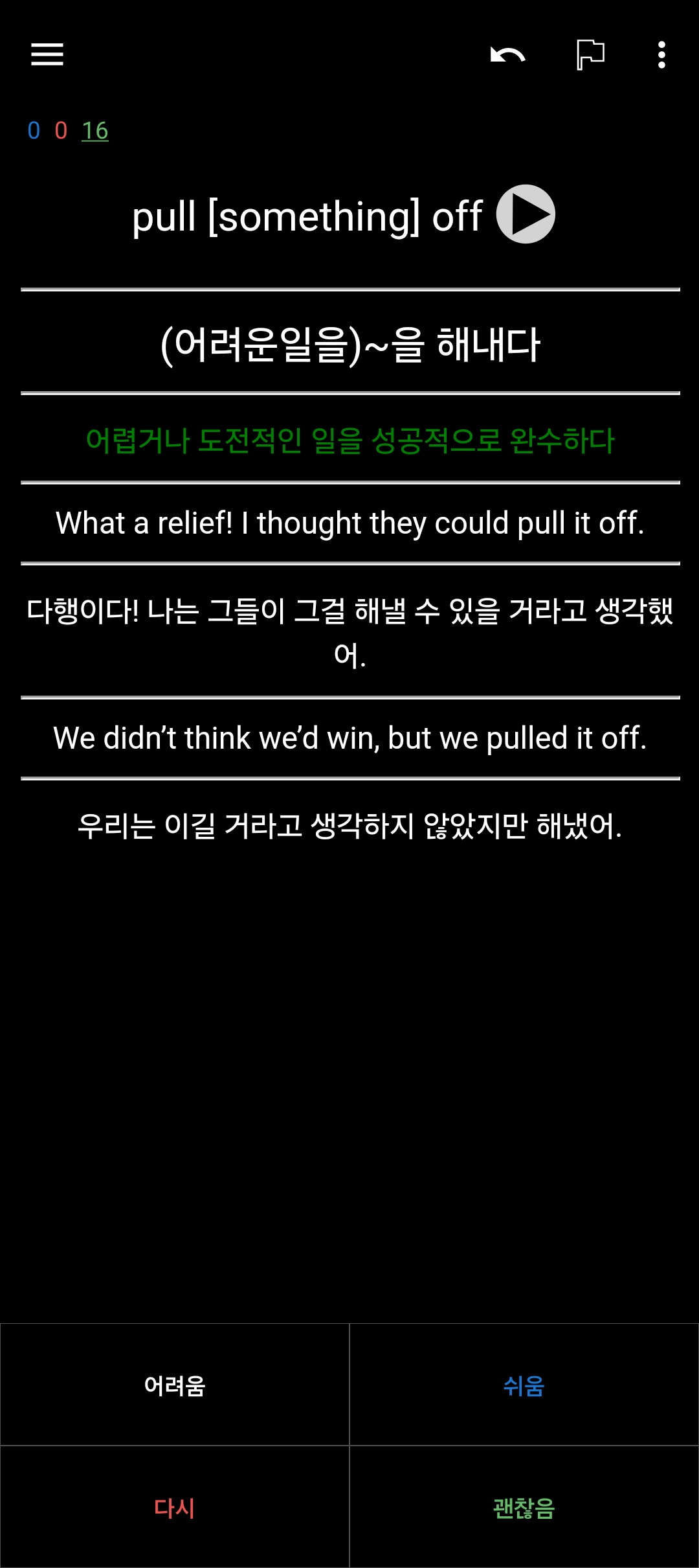 핸드폰에서 위,아래,좌,우 아무 방향으로나 스와이프하면 정답화면(뜻과 예문, 해석)이 나타납니다.