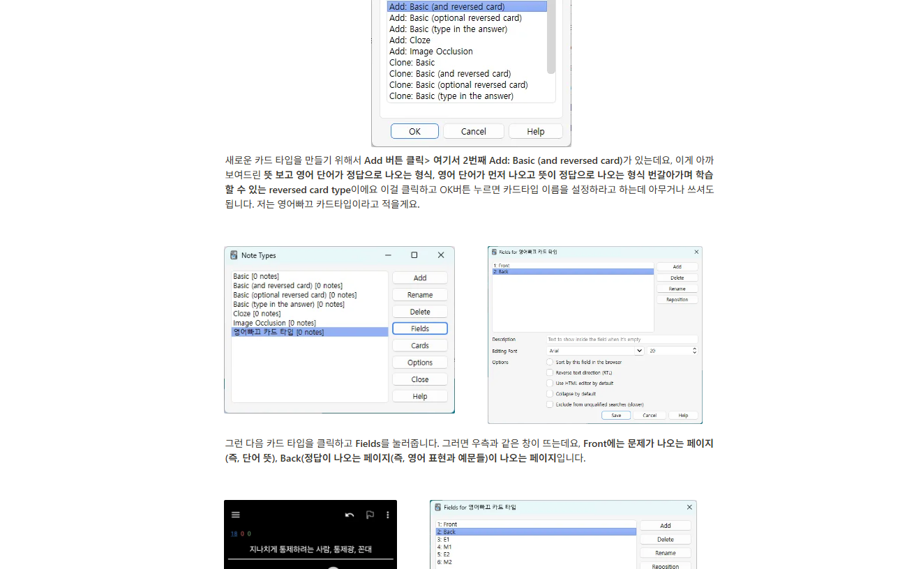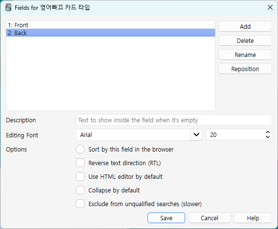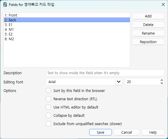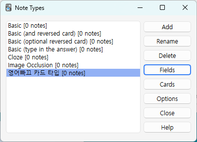 그런 다음 카드 타입을 클릭하고 Fields를 눌러줍니다. 그러면 우측과 같은 창이 뜨는데요, Front에는 문제가 나오는 페이지(즉, 단어 뜻), Back(정답이 나오는 페이지(즉, 영어 표현과 예문들)이 나오는 페이지입니다.