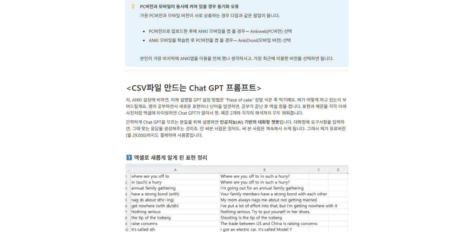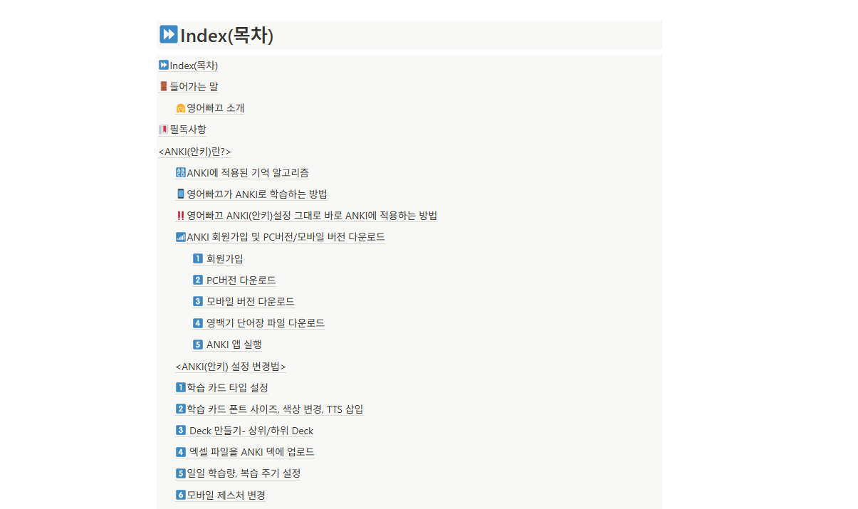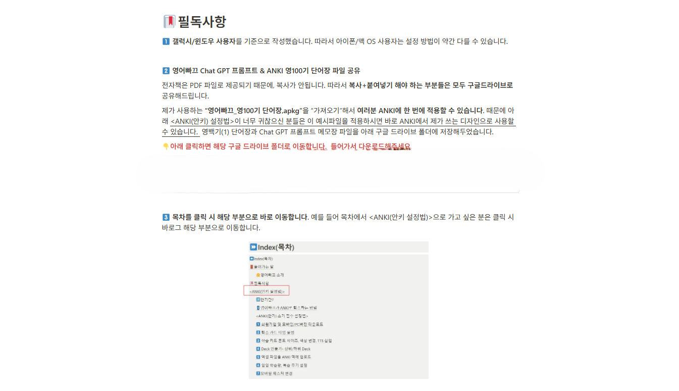 위 블로그에는 공개가 안 된 세세한 안키사용법, Chat GPT 프롬프트까지 모든 노하우를 40페이지 분량의 전자책으로 만들었습니다. 물론 제가 위에서 설명한 영100기 ANKI 단어장 파일도 다운로드 받을 수 있습니다.