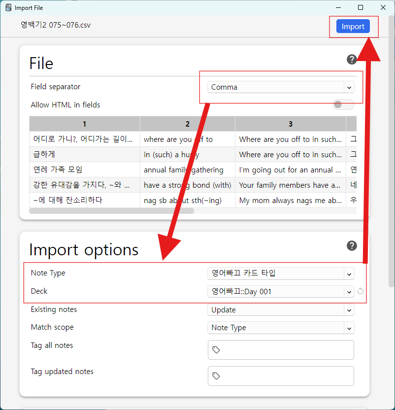 다시 ANKI PC버전으로 돌아와서, 먼저 안키 홈에서 "Import file"을 클릭하고 업로드하고자 하는 파일을 선택합니다. 저는 미리 만들어둔 아까 보여드린 엑셀 영백기 파일을 업로드해볼게요. 상단에서 Field separator(필드 구분 방식)을 Comma로 선택하세요. (가끔 Semicolon으로 되어 있는데, Comma로 바꿔주세요). 그리고 Import options의 Note Type에서 영어빠끄 카드 타입(아까 우리가 만든 카드 타입)을 택해줍니다. 그리고 어느 Deck에 넣을 건지 선택해주면 됩니다. 저는 영어빠끄::Day 001 하위 덱을 선택했습니다. 그리고 가장 위 Import 버튼을 누르면 끝입니다.