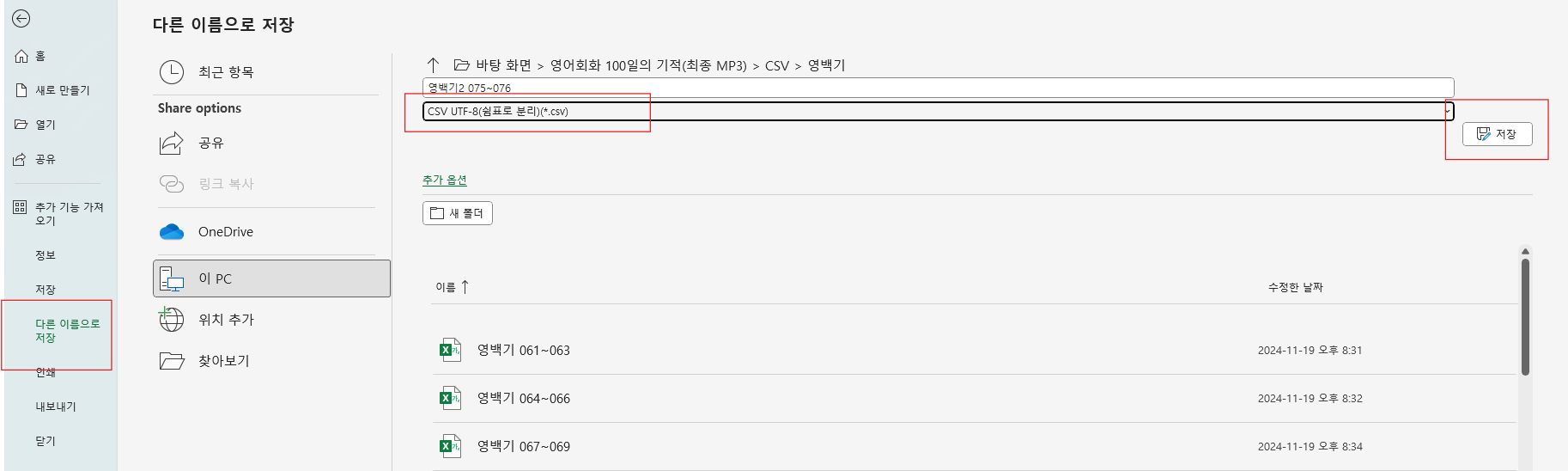 이 파일을 CSV 형식의 파일로 만들건데요. 우선 엑셀 좌측 상단에 “파일>다른 이름으로 저장”을 클릭해서 원래 엑셀 저장하듯 진행해줍니다. 그리고 여기서 주의할 점이 파일명 저장 형식을 선택할 수 있는데요, 꼭 “CSV UTF-8(쉼표로 분리)(*.csv)”를 선택하고 저장해야 합니다. 그래야 ANKI에 업로드할 수 있습니다.