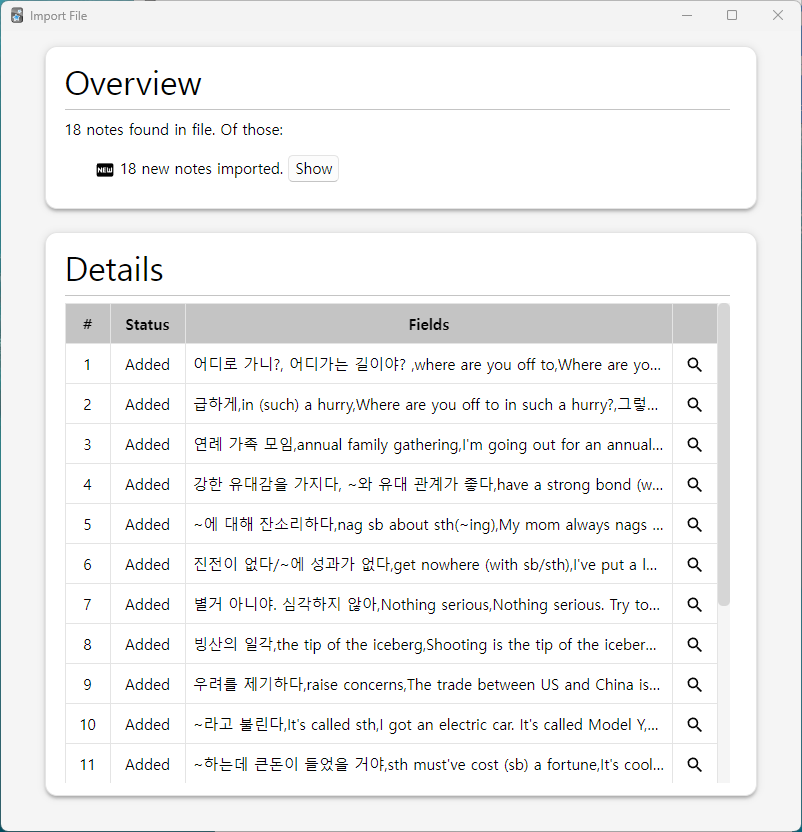 업로드되면, 이런 창이 뜹니다. Added는 업로드가 되어 덱에 추가되었다는 의미에요. 그런데 가끔 ‘Undated’이 뜬 경우엔 상위 덱(영백기)에 같은 표현이 존재해서 중복되어 업데이트가 된 경우입니다. 또한 'skipped'나 'failed'도 가끔 뜨는데, ‘skipped’는 이미 같은 덱에 중복되어 있어서 건너뛴 것이고, ‘failed’ 엑셀 파일을 제대로 인식하지 못한 경우예요. 이럴 때는 엑셀 파일로 돌아가 행과 열이 올바르게 정렬되어 있는지 확인해보세요.