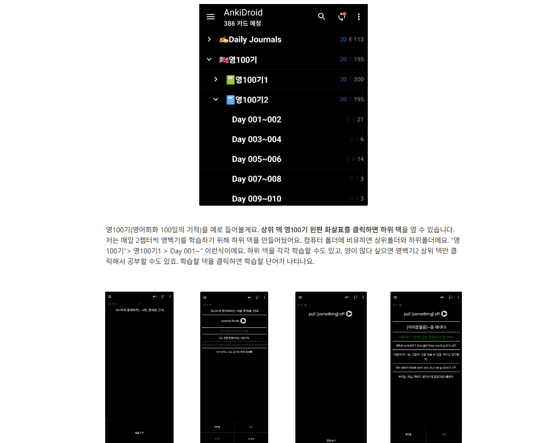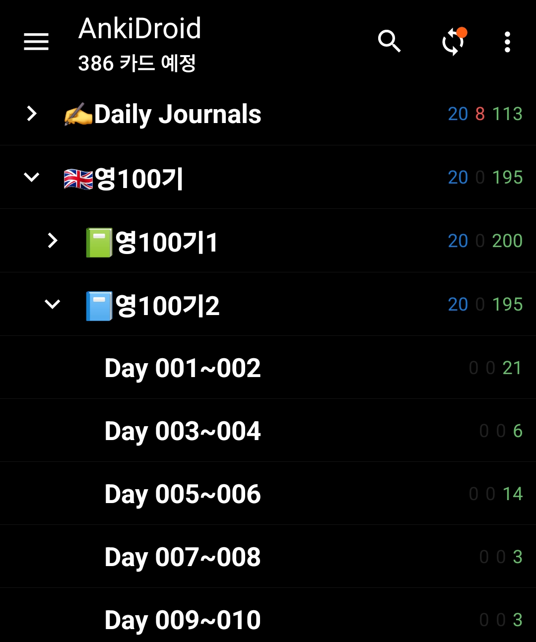 영100기(영어회화 100일의 기적)를 예로 들어볼게요. 상위 덱 영100기 왼편 화살표를 클릭하면 하위 덱을 열 수 있습니다. 저는 매일 2챕터씩 영백기를 학습하기 위해 하위 덱을 만들어뒀어요. 컴퓨터 폴더에 비유하면 상위폴더와 하위폴더에요. “영100기”> 영100기1 > Day 001~” 이런식이에요. 하위 덱을 각각 학습할 수도 있고, 양이 많다 싶으면 영백기2 상위 덱만 클릭해서 공부할 수도 있죠. 학습할 덱을 클릭하면 학습할 단어가 나타나요.
