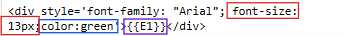 먼저 보라색 박스를 보면이 E1이라는 뜻은 E1부문의 글꼴, 폰트사이즈, 색깔을 바꾼다는 의미입니다. 이 두 줄이 E1부분을 바꿀 수 있다는 거에요. 앞서 저희가 설정한 필드 영역의 E1은 첫 번째 예문의 줄임말이었죠. 이 두 줄의 부분이 예문의 디자인을 변경할 수 있는 값이에요