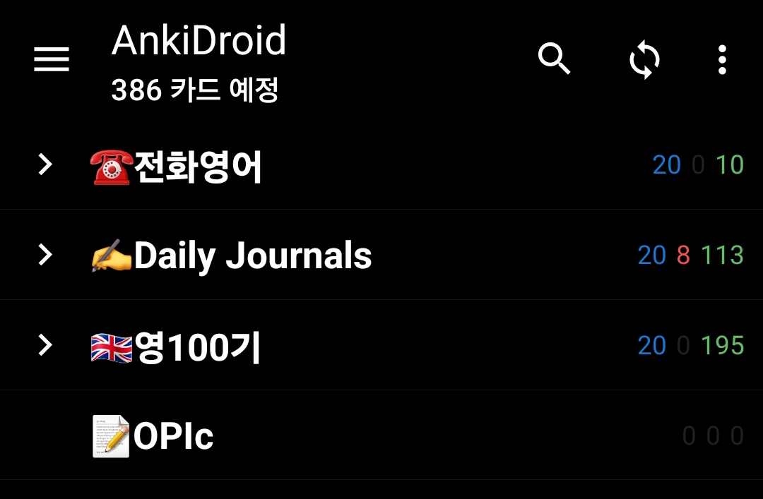 먼저 제 안키 앱을 실행하면 마치 폴더처럼 생긴 4개의 덱(deck)이 보여요. 저는 전화영어, 영어일기, 영어회화 100일의 기적 공부, OPIc 스크립트 작성에 사용하고 있어요. 각 덱 옆에 있는 숫자들의 의미를 알려드리자면, 파란색은 새로 학습할 단어 개수, 빨간색은 틀리거나 헷갈렸던 단어 개수, 초록색은 복습이 필요한 단어 개수예요. 이 개수는 원하는 대로 조정할 수 있답니다.