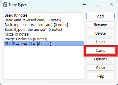 새로운 카드 타입을 만들기 위해서 Add 버튼 클릭> 여기서 2번째 Add: Basic (and reversed card)가 있는데요, 이게 아까 보여드린 뜻 보고 영어 단어가 정답으로 나오는 형식, 영어 단어가 먼저 나오고 뜻이 정답으로 나오는 형식 번갈아가며 학습할 수 있는 reversed card type이에요 이걸 클릭하고 OK버튼 누르면 카드타입 이름을 설정하라고 하는데 아무거나 쓰셔도 됩니다. 저는 영어빠끄 카드타입이라고 적을게요.
