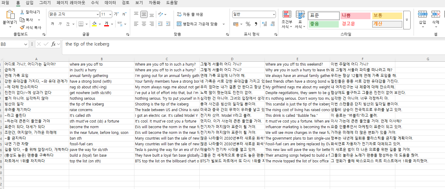 우선 예시로 제가 공부하는 영백기에 나온 표현들을 GPT가 정리해줘서 엑셀에 복사 붙여넣기 한 모습이에요. 첫 번째 열부터 순서대로 단어 뜻(Front), 영어표현(Back), 예시1(E1), 해석1(M1), 예시2(E2), 해석2(M2)입니다. 각각의 행이 하나의 카드로 만들어진다고 생각하면 돼요.