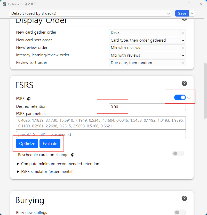 FSRS는 안키의 새로운 기억 알고리즘인데요, 이왕이면 최신 기술을 활용하는 게 좋잖아요? 복습주기 설정창의 FSRS를 활성화하면 아래에 Desired retention이 나타나는데, 이건 원하는 기억 유지율을 의미해요. 즉, 학습한 단어를 얼마나 잘 기억하고 싶은지 퍼센트로 설정하는 거예요. 보통 80~90% 설정을 추천하는데, 저는 90%로 설정하고 싶어서 0.90을 입력했어요. save 버튼을 눌러 저장하고, 나중에 어느 정도 ANKI로 학습한 후에 FSRS의 Optimize 버튼을 누르면 더 개인 맞춤형으로 조정된다고 보시면 돼요. 물론 필수사항은 아니에요.