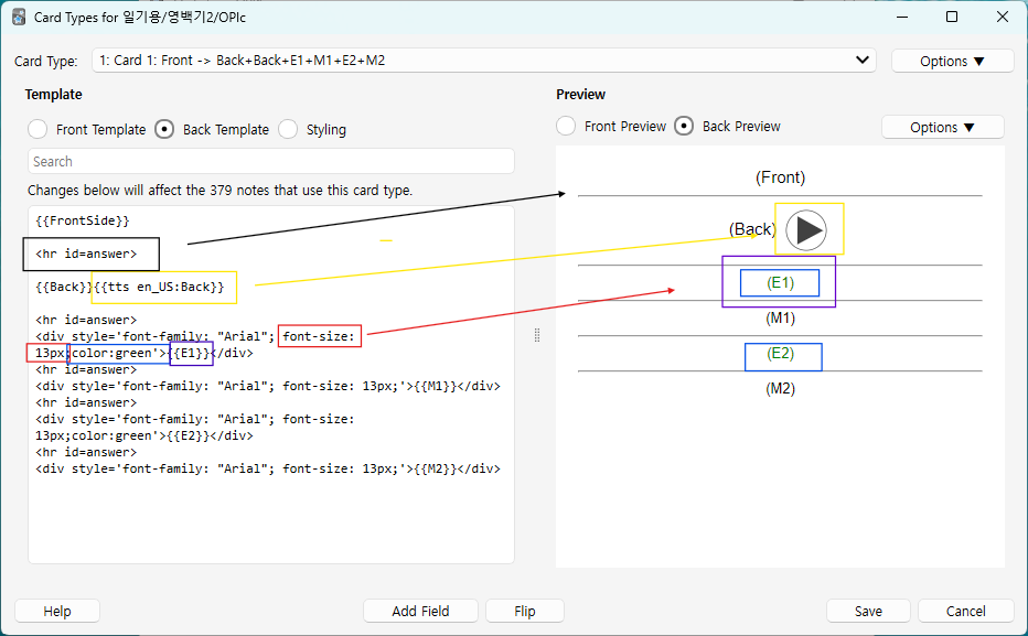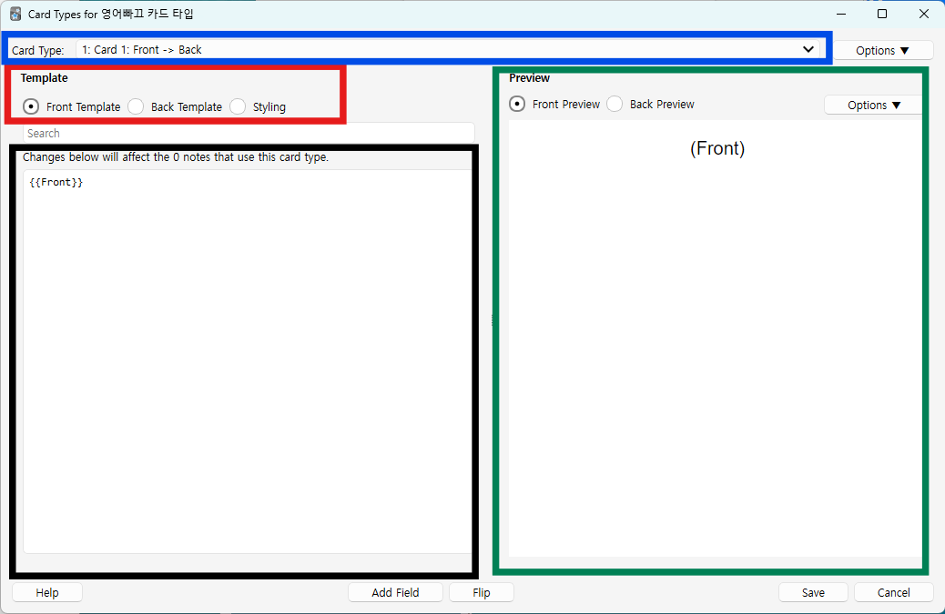 Card를 클릭하면 위와 같은 창이 뜹니다. 제가 표시해둔 각각의 색깔 박스를 설명드릴게요. 빨간박스 - 왼쪽에는 설정할 템플릿,(Front, back, styling은 카드의 앞면, 뒷면, 기본 폰트, 디자인 변경) 초록박스 - 오른쪽에는 미리보기 검정박스 - 각 템플릿의 디자인을 변경하기 위해 값을 입력 파란박스 - Card1: Front→ Back, Card2: Back→Front (뜻보고 단어 맞추기, 단어보고 뜻 맞추기)
