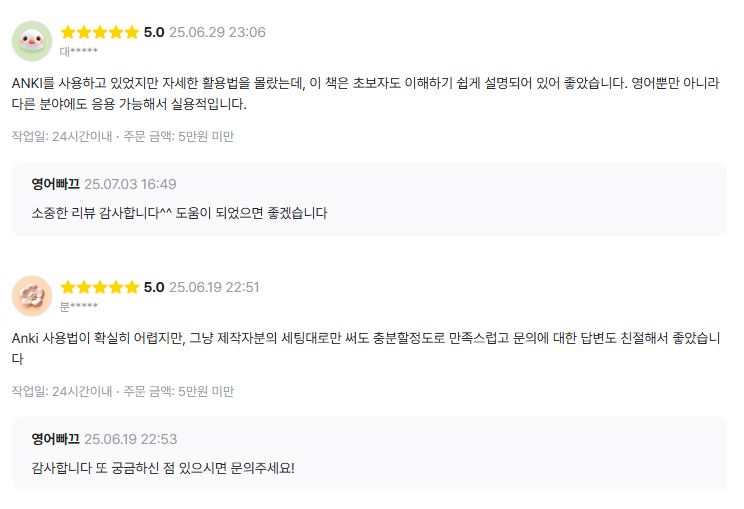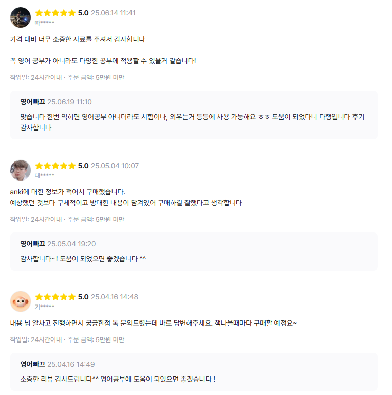 판매 시작한지 얼마되지 않았는데도, 몇몇 분들이 도움이 크게 된다는 후기를 남겨주셨습니다 (뿌듯)