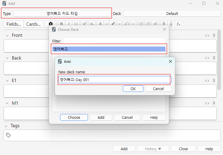 매일매일 영어 공부하는 책이나 특정 챕터를 하위덱으로 설정하고 싶다면 상단의 Add를 클릭하세요. Type은 아까 카드 타입 단어1, 뜻1, 예문2개의 카드를 지칭합니다. 타입에서 영어빠끄 카드타입 택해주고 만들었었죠, 위에서 만든 상위 덱(영어빠끄)을 클릭하고 ::을 입력한 후 "영어빠끄::Day 001"처럼 입력하면 하위 덱에 “Day 001”이 생성됩니다.
