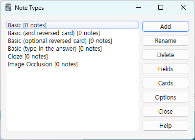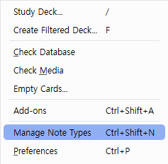 우선 제가 사용하는 카드타입을 설정해볼게요. 상단에 Tools > Manage note types을 클릭해줍니다. 그러면 이미 있는 노트 타입들이 있는데요, 이건 삭제하셔도 되고 놔두셔도 됩니다.