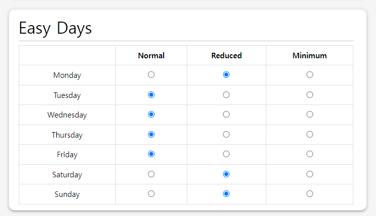 스크롤을 쭉 내리다 보면 Easy Days에서는 요일별 학습량을 설정할 수 있어요. 바쁜 날은 최소로 설정해놓으면 좋겠죠? 저는 월, 토, 일만 reduced로 설정해서 학습량을 좀 줄여놨습니다.